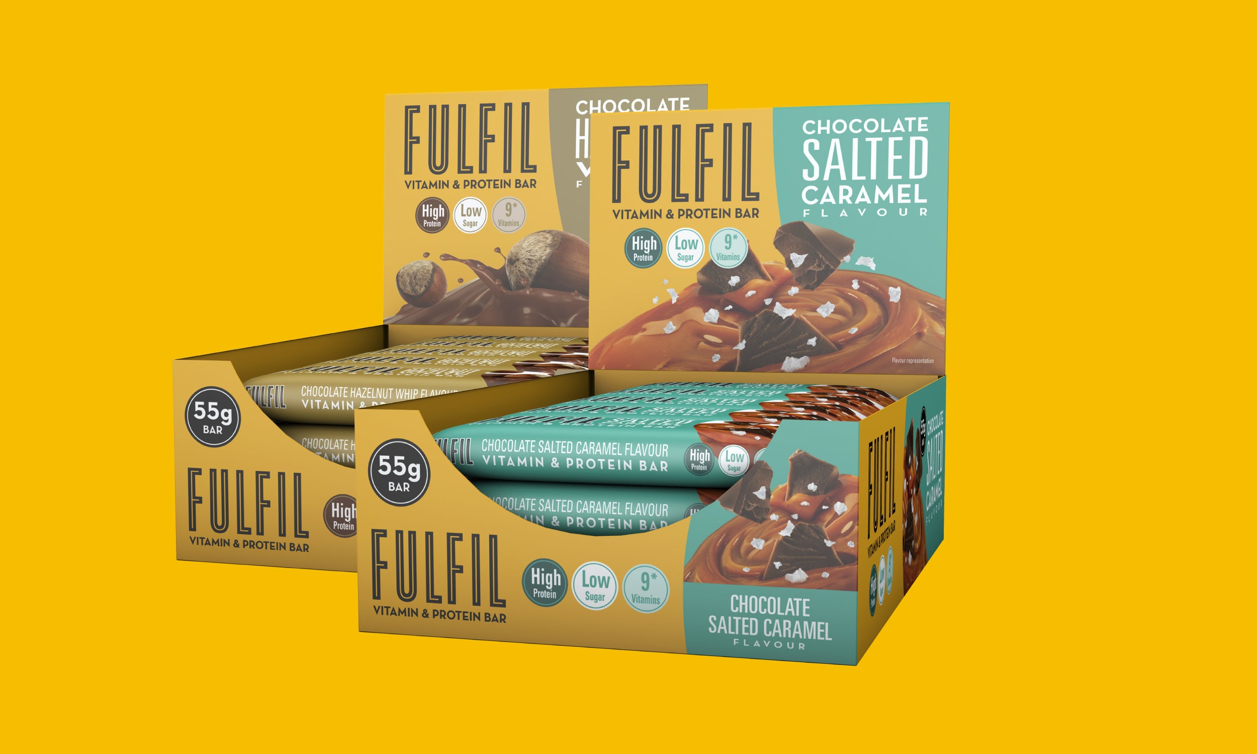 FULFIL bars (55g) are packed with at least 18g protein. That’s at least 33% protein per bar, making FULFIL one of the highest protein bars